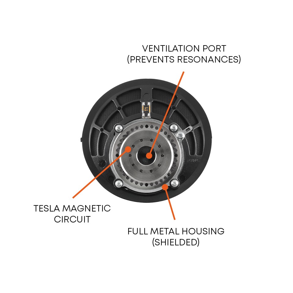 The voice coil in the tesla acoustic transducer is shielded by the full metal housing to protect against electromagnetic fields.