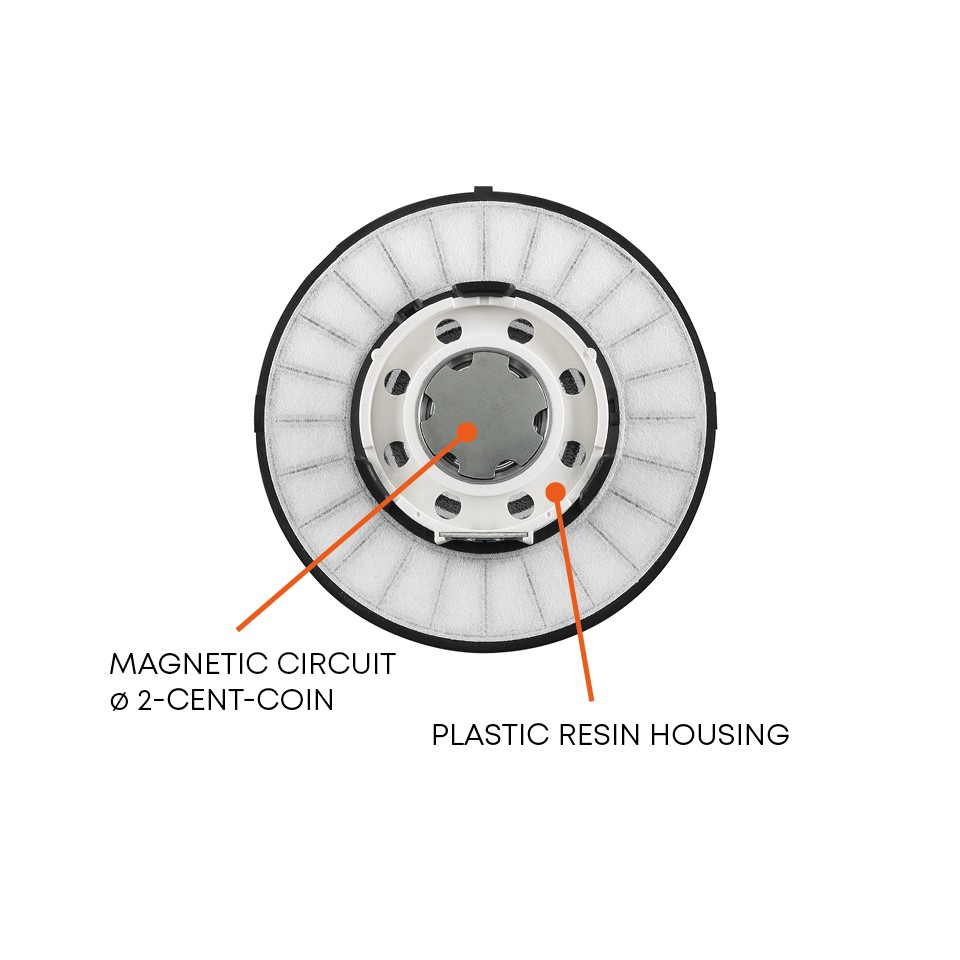 Maximum magnetic field focusing in the air gap – the strong tesla magnetic field is located within the acoustic transducer (concentrated in the air gap). The external scattered magnetic field is extremely small in order to minimise losses.